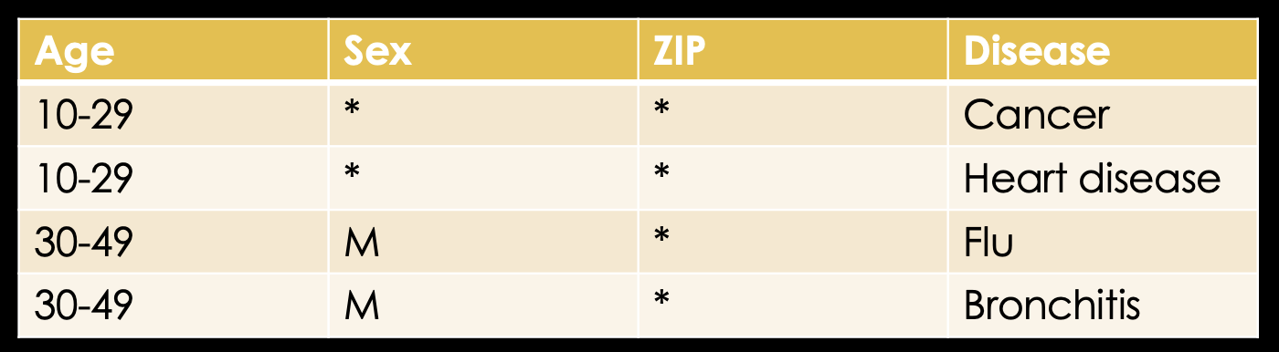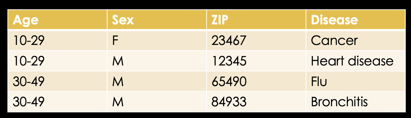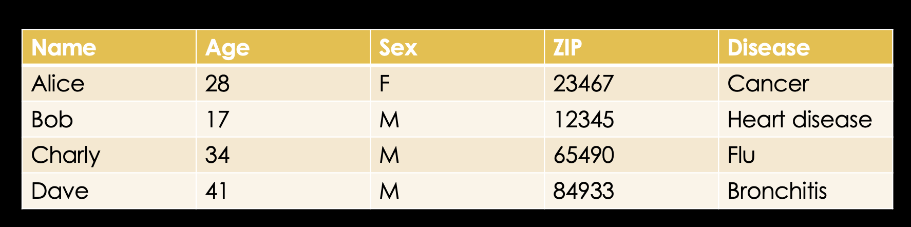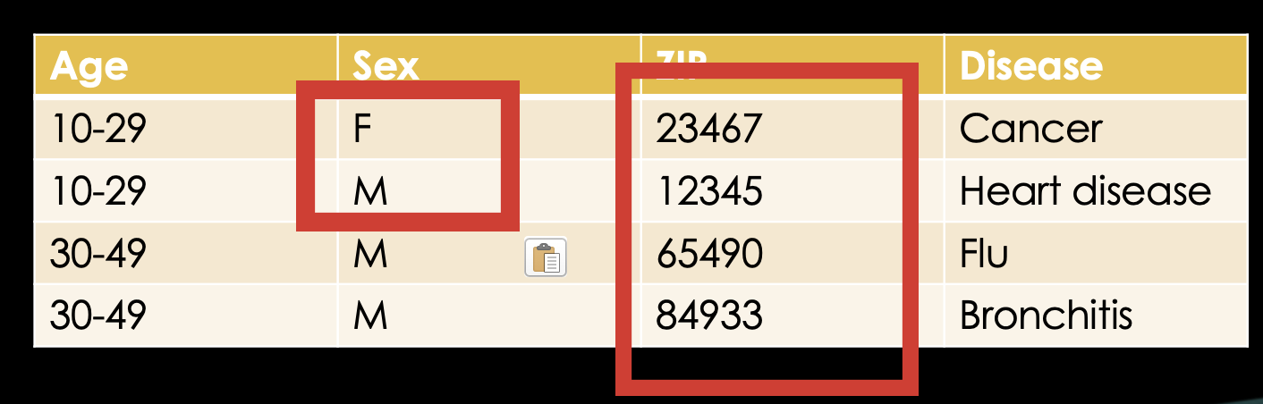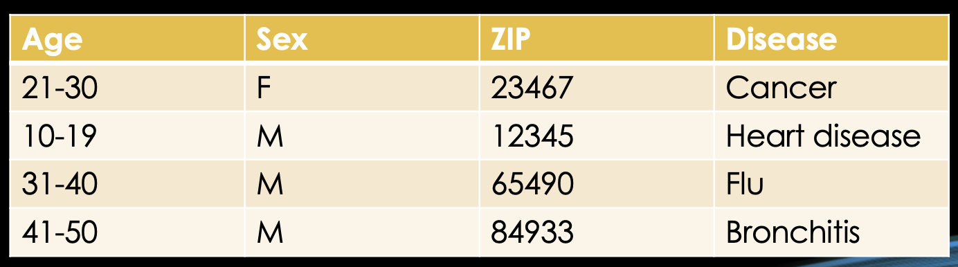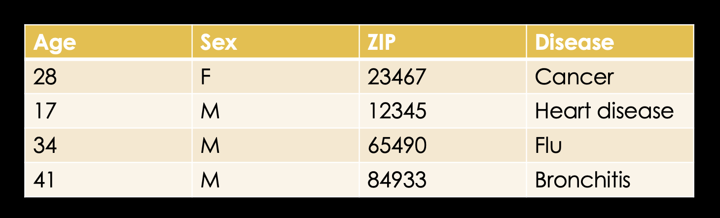 Knowing that, let's look at an example database which might exist in some hospital somewhere. We have the name of the patient, their age, sex, ZIP code and finally the disease they're in for.