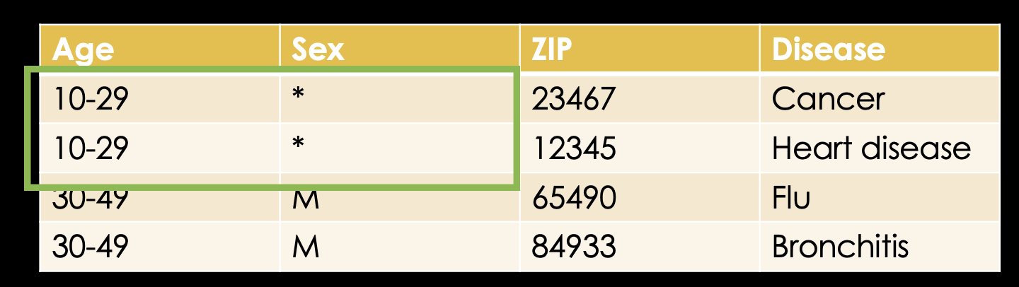 Note, that we could've just as easily generalized the ZIP code and, thus, retained some information that is lost by suppression.